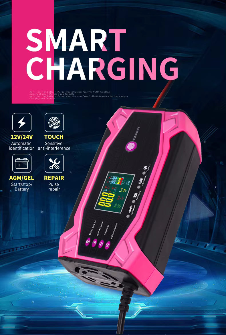 Redresor Auto Inteligent 12V / 24V 10A cu Smart Pulse Repair, Afișaj LCD, Încărcare Automată, Protecții Complete, Mod Iarnă și Vară, pentru Auto și Motocicletă, Roz